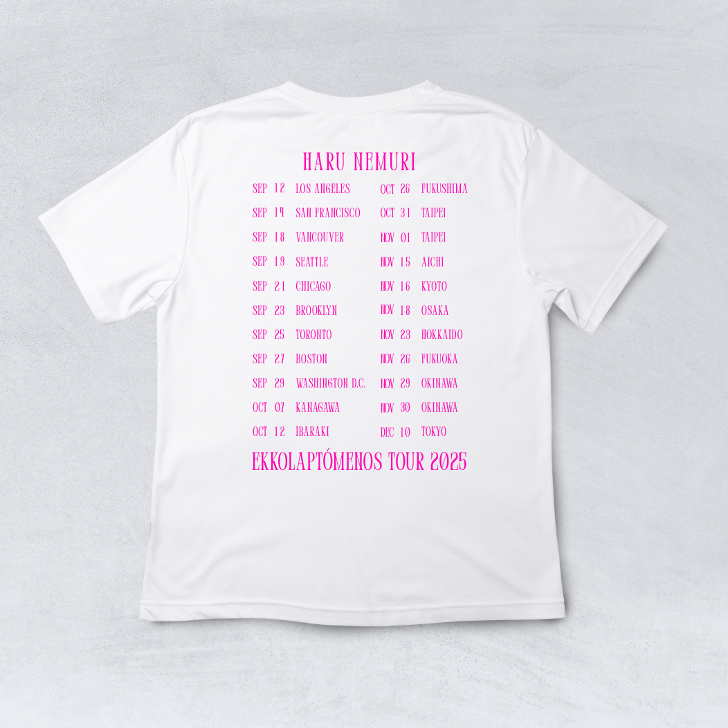 バックには、北米・アジア・日本を横断したツアースケジュールをピンク一色で整然と配置。無機質な日付と都市名の羅列が、フロントの有機的イメージと強いコントラストを生み、2025年ツアーの記録をストレートに刻み込む。